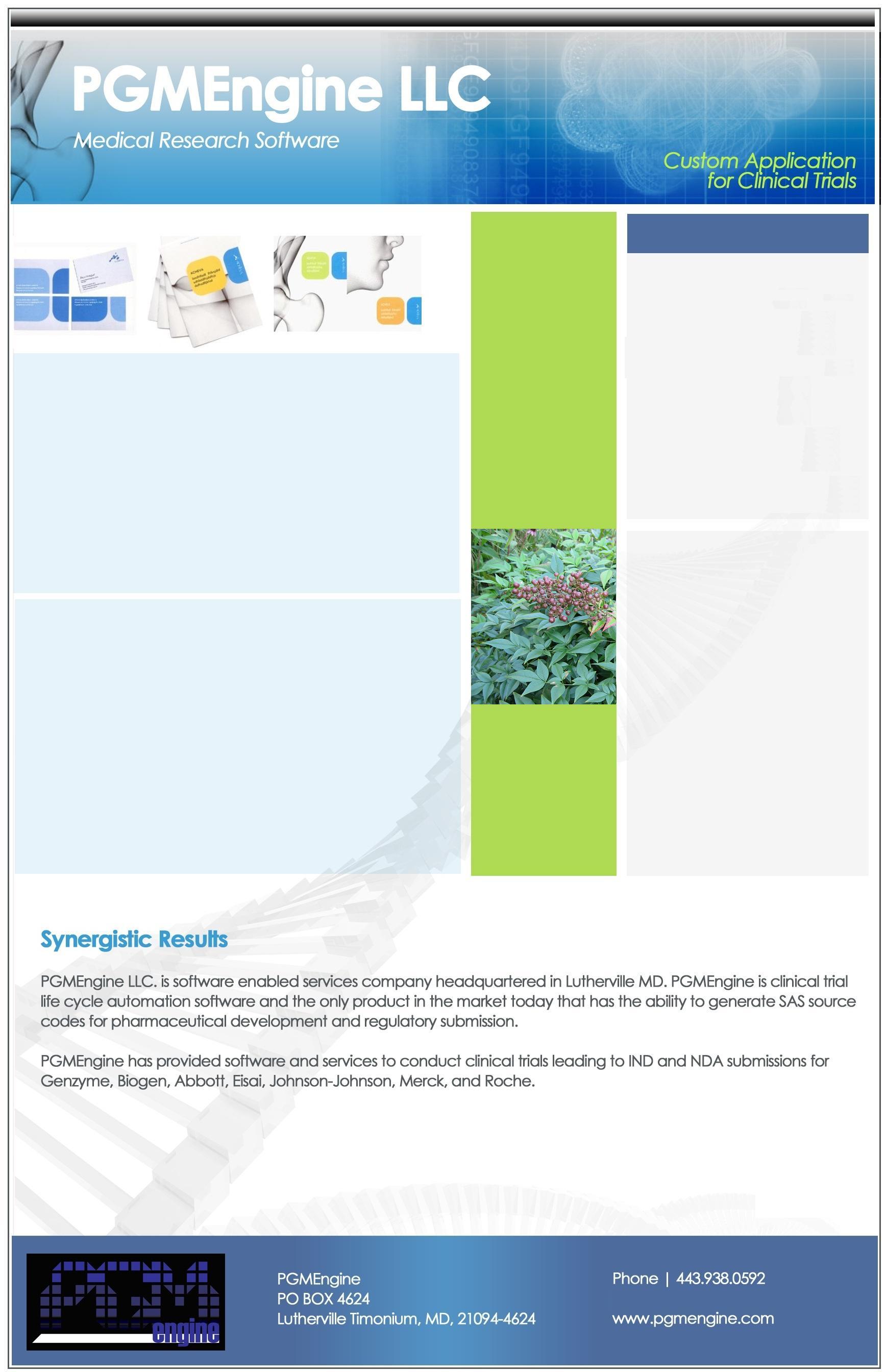The Company has developed PGMEngine™, a Windows/UNIX based software product that meets the strict 21 CFR Part 11 requirements of FDA and other global regulatory agencies. This robust Enterprise-class software also can be fully integrated with the clients existing infrastructure as well. We aim to become a globally recognized brand name, capitalizing on the sustained interest in the Pharmaceutical industry.